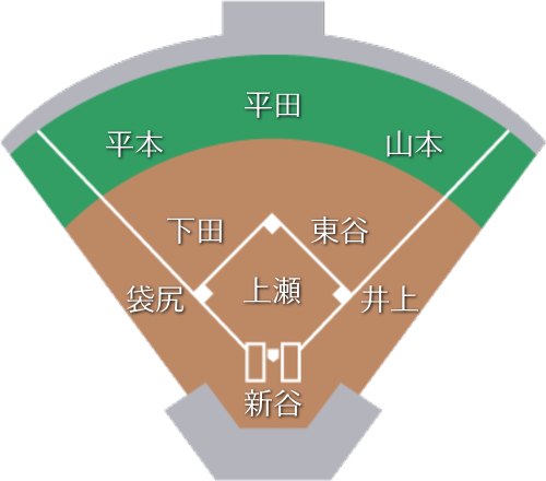 スターティングラインナップ 打順 位置 選手名 学年 投/打 1 左 平本 貴一 2年 右/右 2 優 下田 陽真 2年 右/左 3 三 袋尻 亀助 1年 右/右 4 捕 新谷 修叶 2年 右/右 5 一 井上 耀琉 2年 右/右 6 二 東谷 政男 2年 右/右 7 中 平田 航理 2年 右/左 8 右 山本 篤希 1年 右/右 9 投 上瀬 健聖 2年 右/右